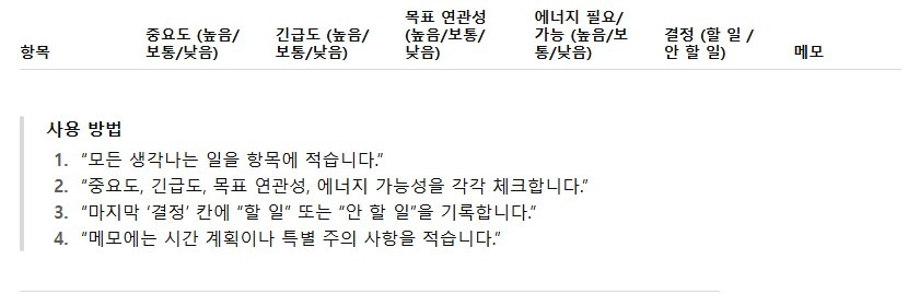 “할 일”과 “안 할 일”을 구별하는 것은 단순히 목록을 만드는 것을 넘어, 우선순위, 중요도, 시간, 에너지 등을 고려하는 사고 과정입니다. 정리해보면 이렇게 접근할 수 있습니다.
