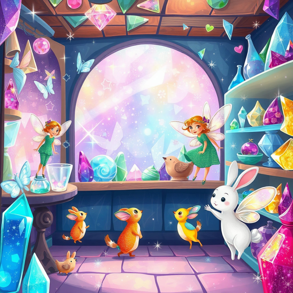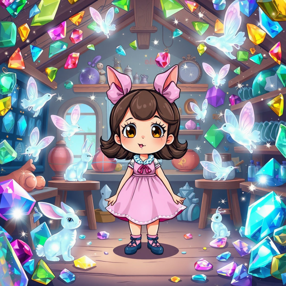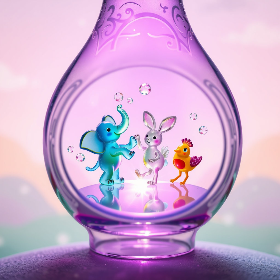 루루는 공방 한쪽에서 작은 투명 유리 동물들을 발견했어요. 토끼, 고양이, 강아지… 손으로 살짝 건드리자 동물들이 깡충깡충 뛰며 루루를 따라다녔죠. “너희들이 내 친구가 되어 줄 거지?” 루루가 물었어요. 유리 동물들은 반짝이는 눈으로 루루를 바라보며 고개를 끄덕였답니다. 루루는 기쁨에 가득 차 새로운 친구들과 놀기 시작했어요.
