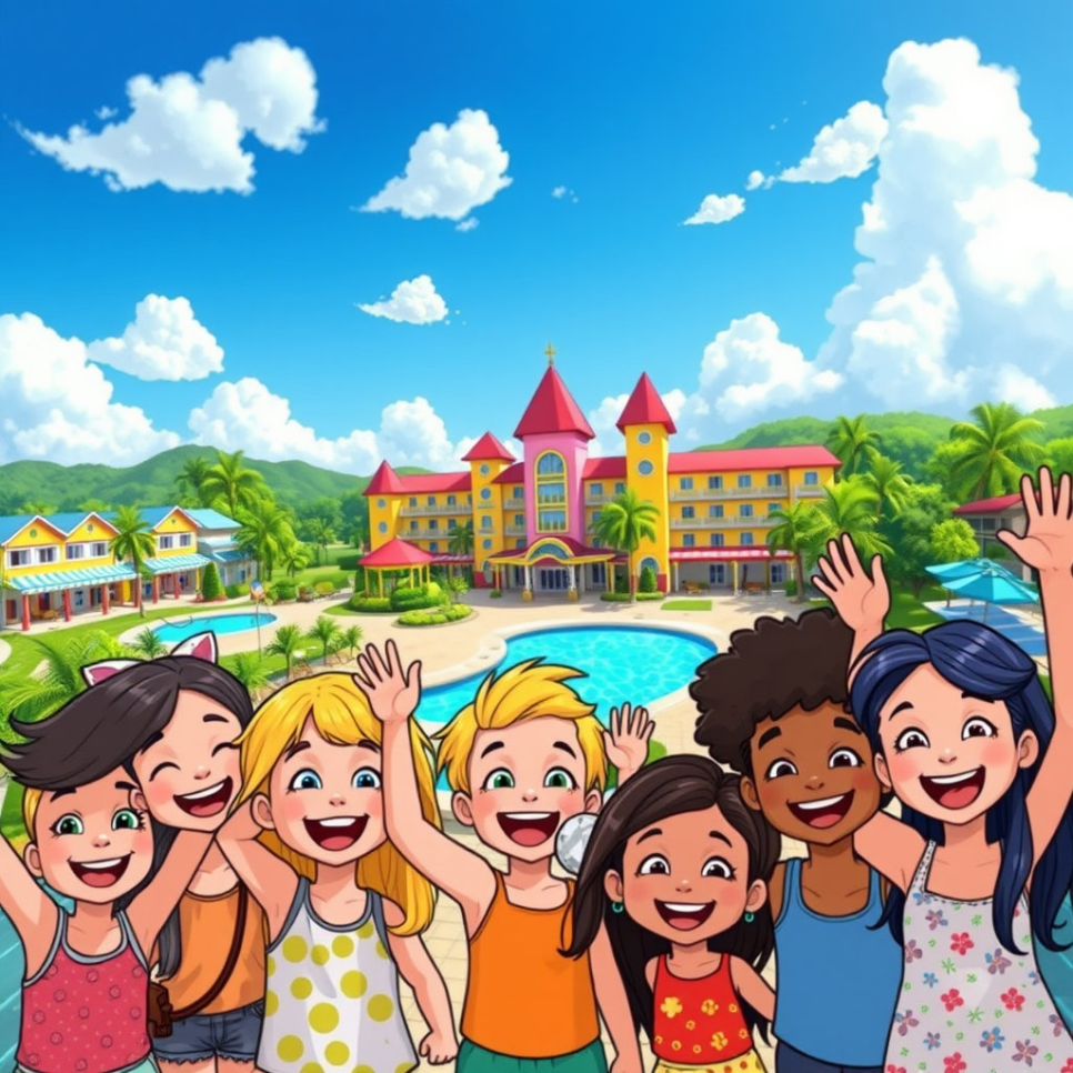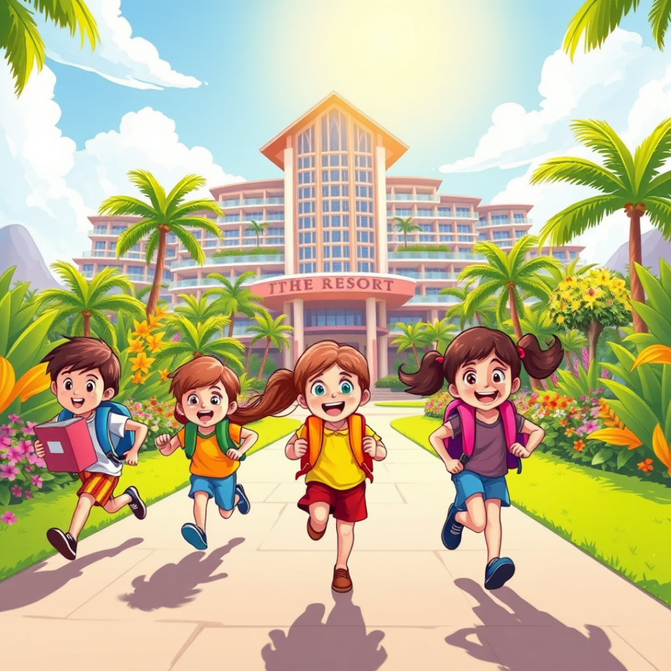 『작은 리조트, 큰 모험!』은 아이들이 리조트나 작은 콘도에서 즐거움과 모험을 느끼는 이야기입니다. 주인공 아이들은 친구들과 함께 리조트에 도착해, 방 안, 정원, 수영장, 밤하늘 캠프까지 다양한 경험을 합니다. 깔끔한 방과 발코니, 서랍 속 장난감은 호기심을 자극하고, 친구들과의 탐험과 숨은 장소 찾기로 즐거움이 가득합니다. 정원에서는 숨바꼭질과 작은 동물들과의 만남을, 식사 시간에는 이야기와 웃음을 나눕니다. 수영장에서는 물놀이와 다이빙, 밤에는 별빛 캠프와 소원 속삭임이 이어집니다. 작은 콘서트와 놀이 프로그램을 즐기며 하루를 마무리하고, 떠나는 날에는 아쉬움 속에서도 다음 모험을 기대합니다.