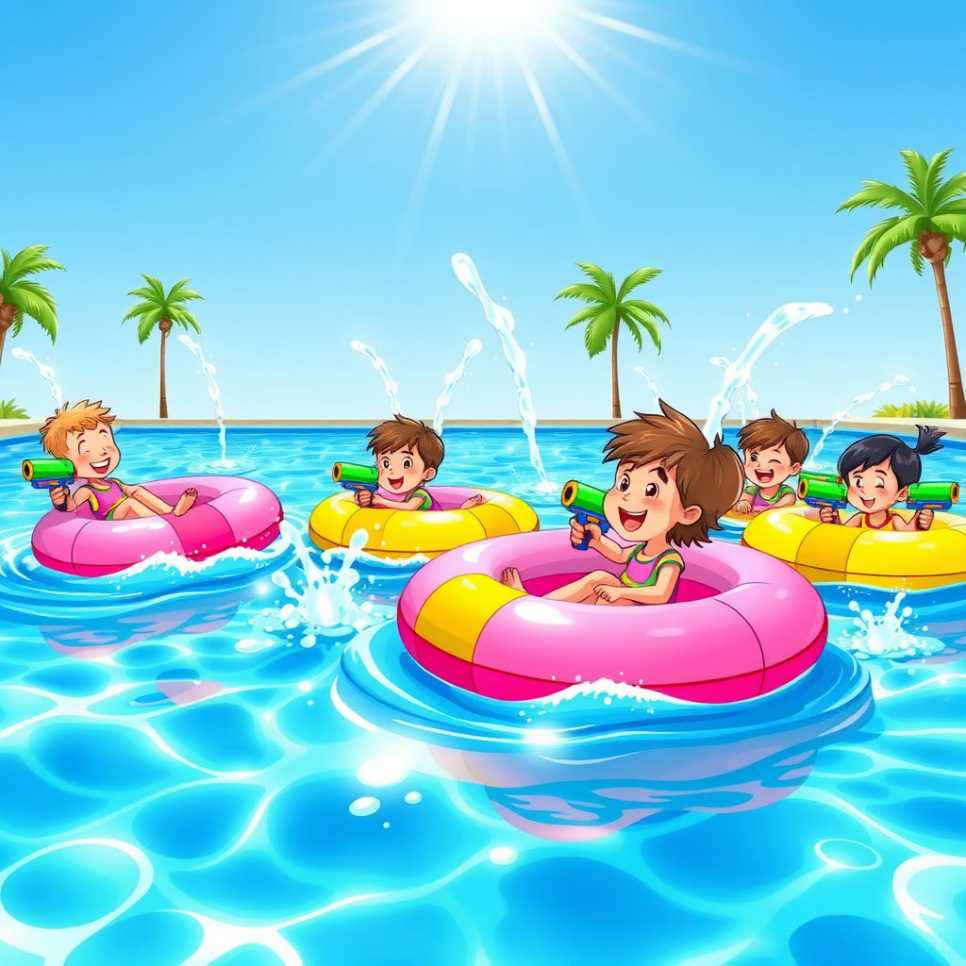수영장에서는 물총 싸움이 시작되었다. 튜브에 앉아 빙글빙글 돌고, 다이빙도 해보고, 물속에서 숨바꼭질도 했다. 물방울이 튀며 모두 얼굴에 즐거운 웃음을 가득 채웠다.