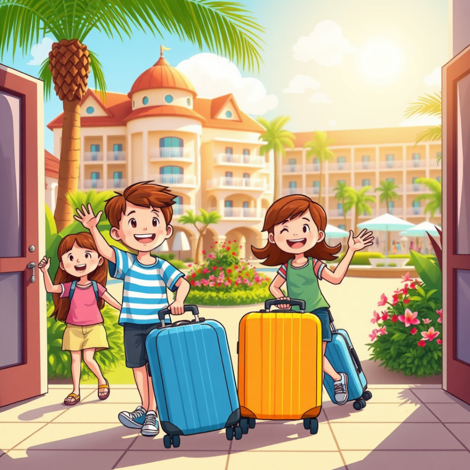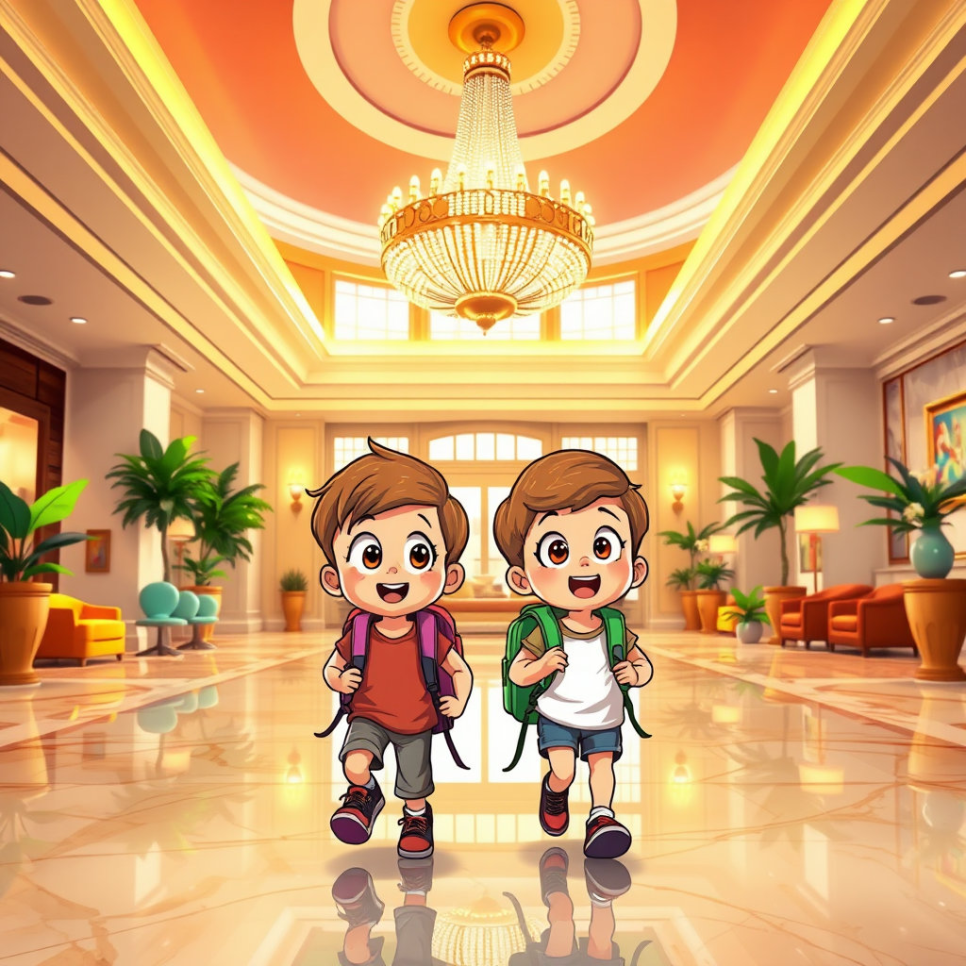 오늘은 리조트로 떠나는 날! 아이들은 커다란 가방을 끌고 로비로 들어섰다. 천장이 반짝이는 샹들리에, 벽마다 걸린 그림, 창밖으로 보이는 작은 정원까지 모두 신기했다. “와! 우리 여기서 모험할 수 있겠어!” 친구들은 손을 잡고 뛰어다니며 즐거워했다.