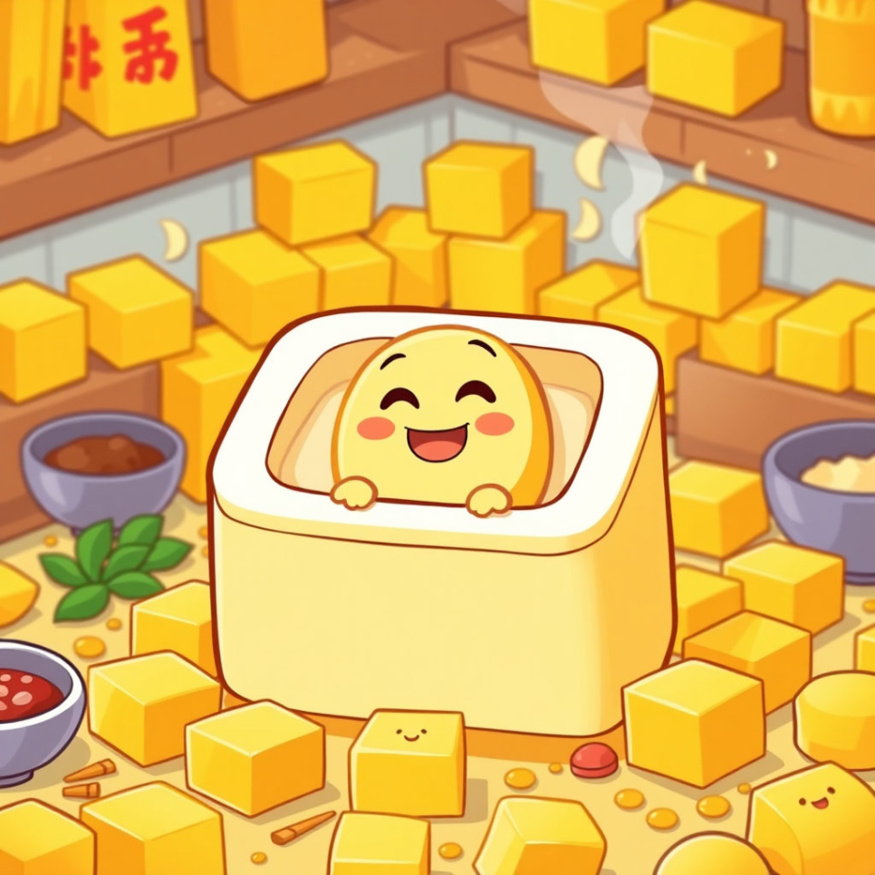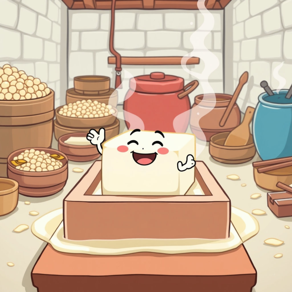 콩콩이는 네모난 틀 속에 들어가 단단하게 눌렸어요. “꽉꽉, 아이고 조금 답답해!” 하지만 곧 단단한 힘이 생기며 멋진 네모난 두부로 변신했어요. “짜잔! 나는 두부가 되었어!” 콩콩이는 자랑스럽게 외쳤답니다.