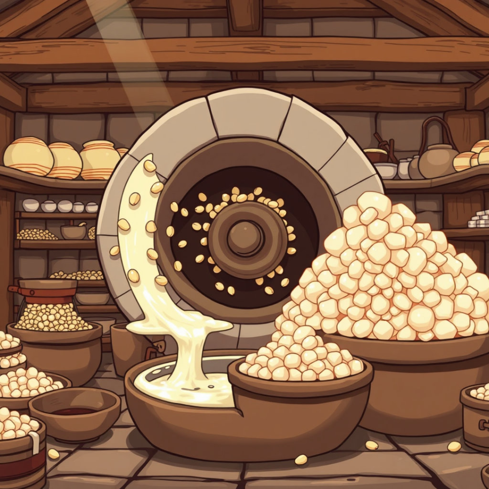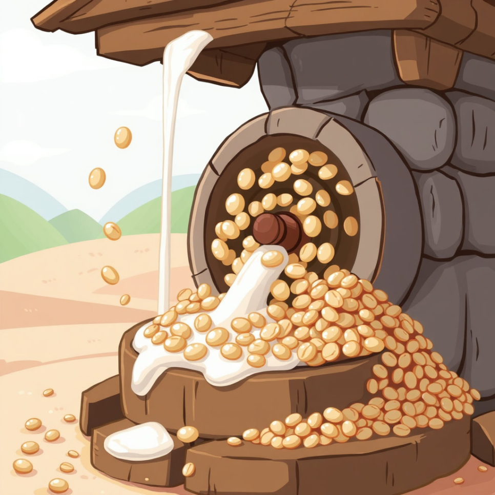 삶은 콩콩이는 큰 맷돌 속으로 들어갔어요. 으드득, 드르륵 소리가 나며 콩콩이가 곱게 갈리기 시작했어요. “아이쿠, 간지럽다!” 갈려 나온 콩콩이는 콩물과 콩비지로 나뉘었지요. “나는 이제 물처럼 변했네!” 콩콩이는 신기해서 깔깔 웃었답니다.