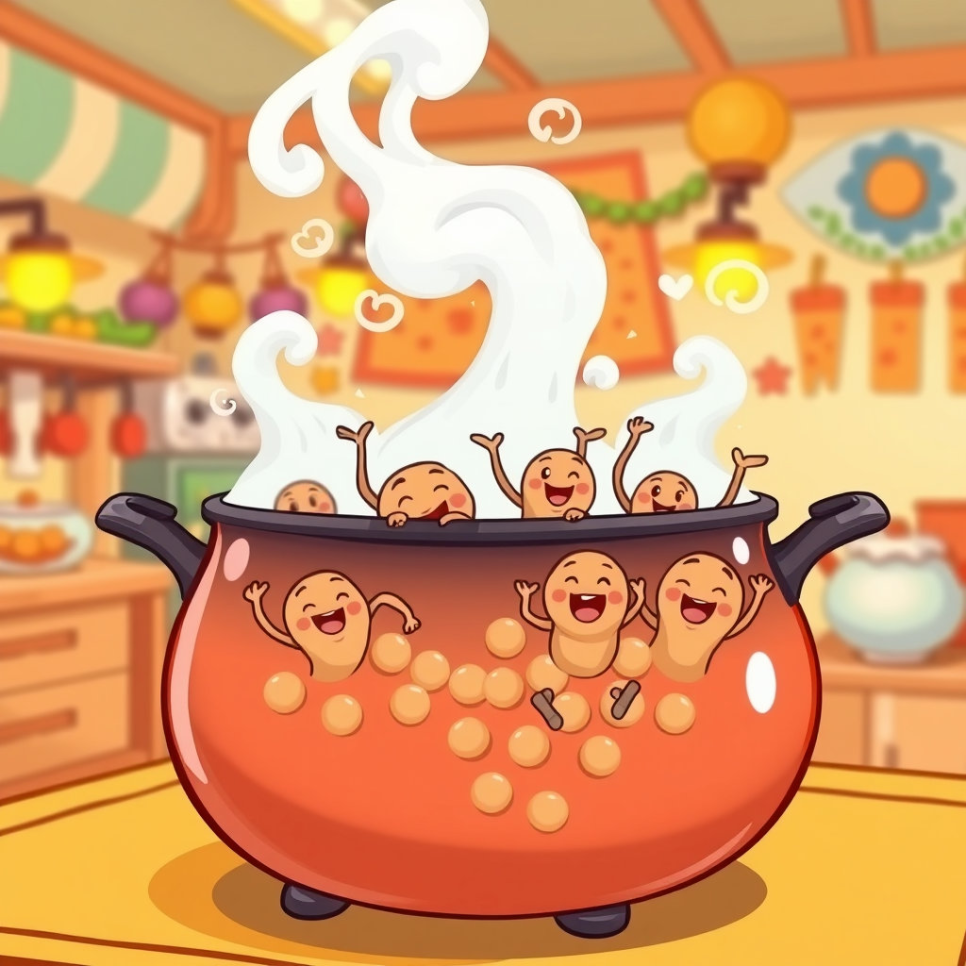 “이제 뜨거운 여행이 시작된다!” 커다란 솥 안으로 들어간 콩콩이는 뜨거운 물 속에서 보글보글 춤을 추었어요. 처음엔 너무 뜨거워서 깜짝 놀랐지만, 금세 익숙해졌지요. “이건 마치 뜨거운 온천 같아!” 콩콩이는 부글부글 끓는 물 속에서 몸이 부드럽게 변하는 걸 느꼈어요. 콩콩이와 친구들은 서로 껴안으며 웃었어요.