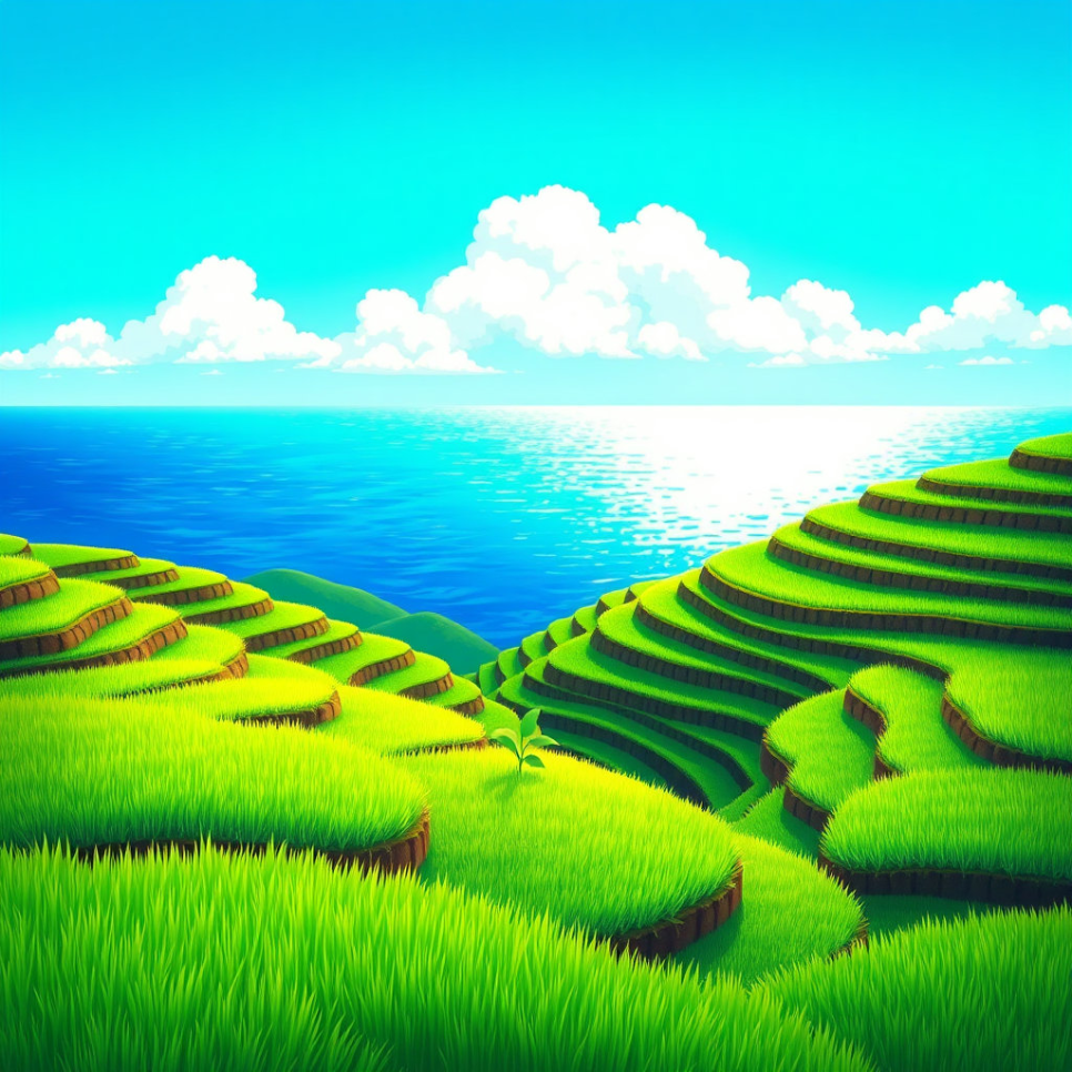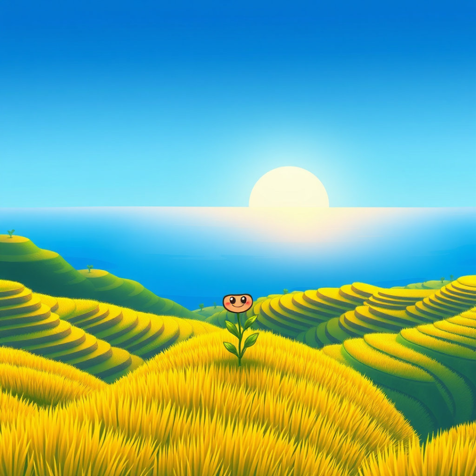 파란 바다가 반짝이는 곳, 층층이 계단을 이룬 신기한 논들이 있어요. 이곳은 바로 다랭이마을이랍니다. 사람들은 바다 바로 옆에 돌을 쌓아 작은 논을 만들고, 또 그 위에 돌을 쌓아 또 다른 논을 만들었지요. 좁고 기다란 논들이 마치 거대한 초록색 계단처럼 바다에서부터 산으로 이어져 있어요. 다른 마을의 논들이 넓고 평평한 것과 달리, 다랭이마을의 논들은 저마다 다른 모양과 크기를 가지고 있었어요. 어떤 논은 길쭉하고, 어떤 논은 둥글고, 어떤 논은 손바닥만 한 것도 있었답니다. 바람이 불면 파도 소리와 함께 논들이 흔들리는 소리가 들렸고, 햇볕이 쨍쨍한 날에는 논물에 바다가 담겨 반짝반짝 빛났어요. 사람들은 이 특별한 논들을 '다랭이'라고 불렀답니다. 꼬마 벼는 바로 이 다랭이논 중에서도 가장 바다와 가까운 곳에서 태어났어요. 꼬마 벼는 바다 냄새를 맡으며 무럭무럭 자랄 생각에 가슴이 두근거렸답니다.