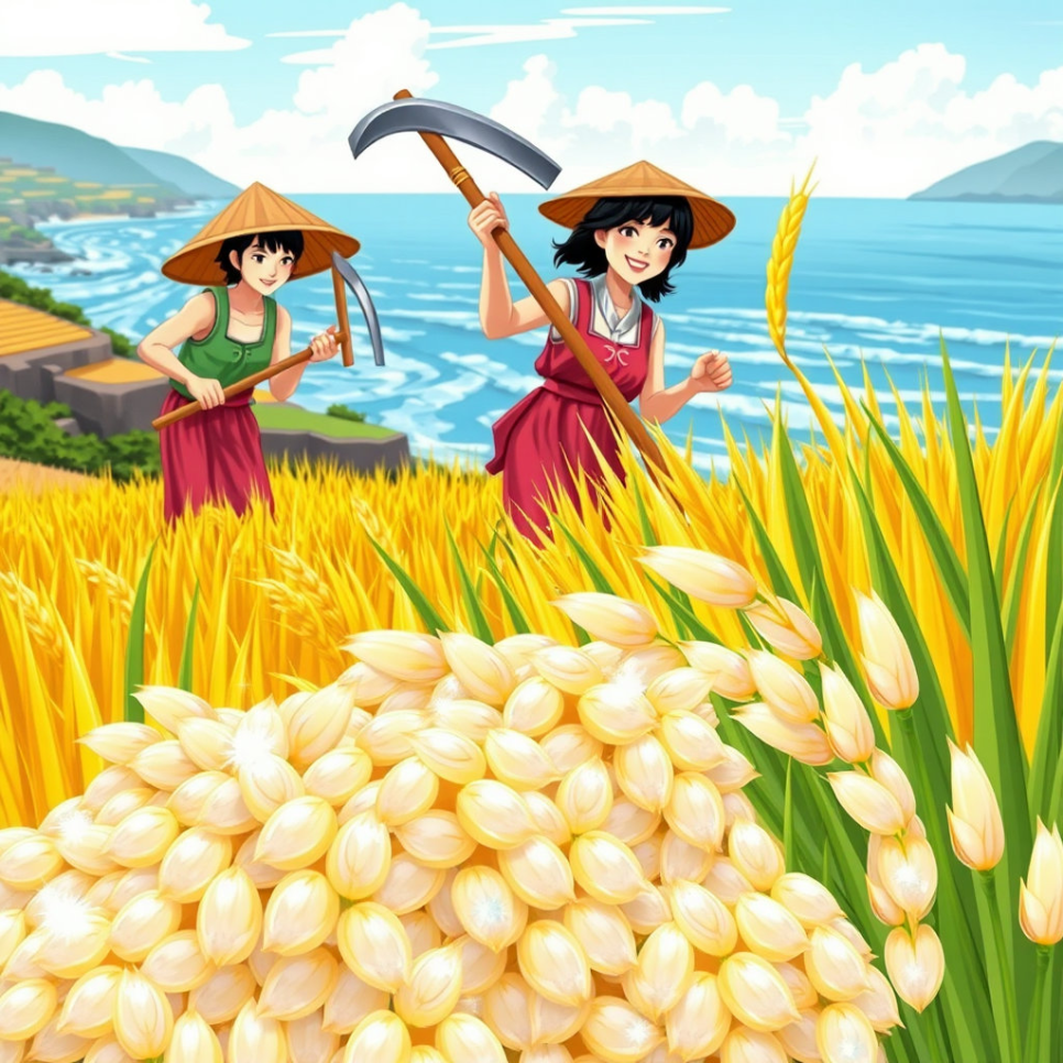 꼬마 벼는 드디어 호남평야에 도착했어요. "와아, 정말 황금 바다 같아요!" 꼬마 벼는 감탄했지요. 끝없이 이어진 논들 사이로 콤바인이라는 커다란 기계가 지나다니며 벼를 수확하고 있었어요. 콤바인이 한 번 지나갈 때마다 벼들이 깨끗하게 베어졌답니다. 다랭이마을의 작은 논들에서는 사람들이 손으로 벼를 베었지만, 이곳의 논들은 너무 넓어서 기계의 도움이 꼭 필요했어요. 호남평야는 우리나라에서 가장 많은 쌀을 만드는 곳이었어요. 꼬마 벼는 이곳에서 자라는 쌀들이 얼마나 많은 사람들을 배불리 먹게 할지 생각하며 가슴이 뿌듯해졌어요. 다랭이마을에서 자란 꼬마 벼의 쌀 한 톨도, 호남평야에서 자란 쌀 한 톨도 모두 소중한 의미를 가지고 있다는 것을 깨달았지요.