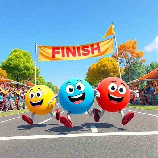 세 공은 줄지어 섰습니다. “이제 경주하자! 누가 제일 빨리 굴러갈까?” 탁구공이 외쳤습니다. 출발 신호가 떨어지자 탁구공은 바람처럼 가볍게 굴렀고, 골프공은 묵직하게 힘차게 달렸으며, 폿게볼은 통통 튕기며 앞으로 나아갔습니다. 누가 이겼을까요? 결과는 아무도 몰라요. 왜냐하면 세 친구는 도착선에 함께 넘어지며 깔깔 웃었으니까요!