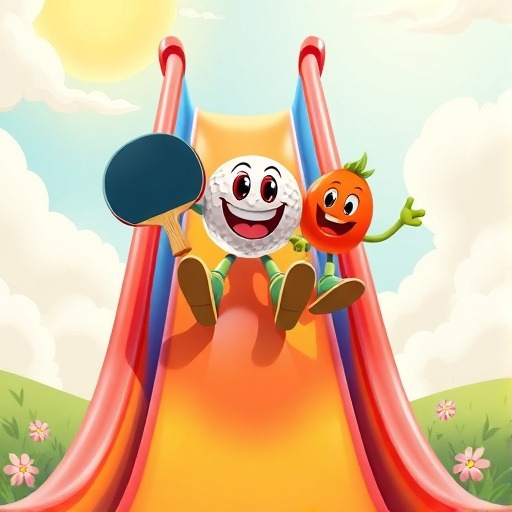 세 친구는 미끄럼틀을 발견했어요. “같이 타면 더 재밌겠다!” 탁구공, 골프공, 폿게볼이 나란히 줄을 서서 미끄럼틀을 탔답니다. 탁구공은 빠르게, 골프공은 묵직하게, 폿게볼은 튕기며 내려왔지요. 끝에 도착하자 서로 부딪혀 빙글빙글 굴러가며 웃음이 터졌어요. “우와! 우리가 함께라서 더 재밌어!”