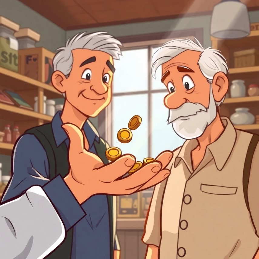 가게 아저씨에게 사과하며 사탕 값을 내는 손이.