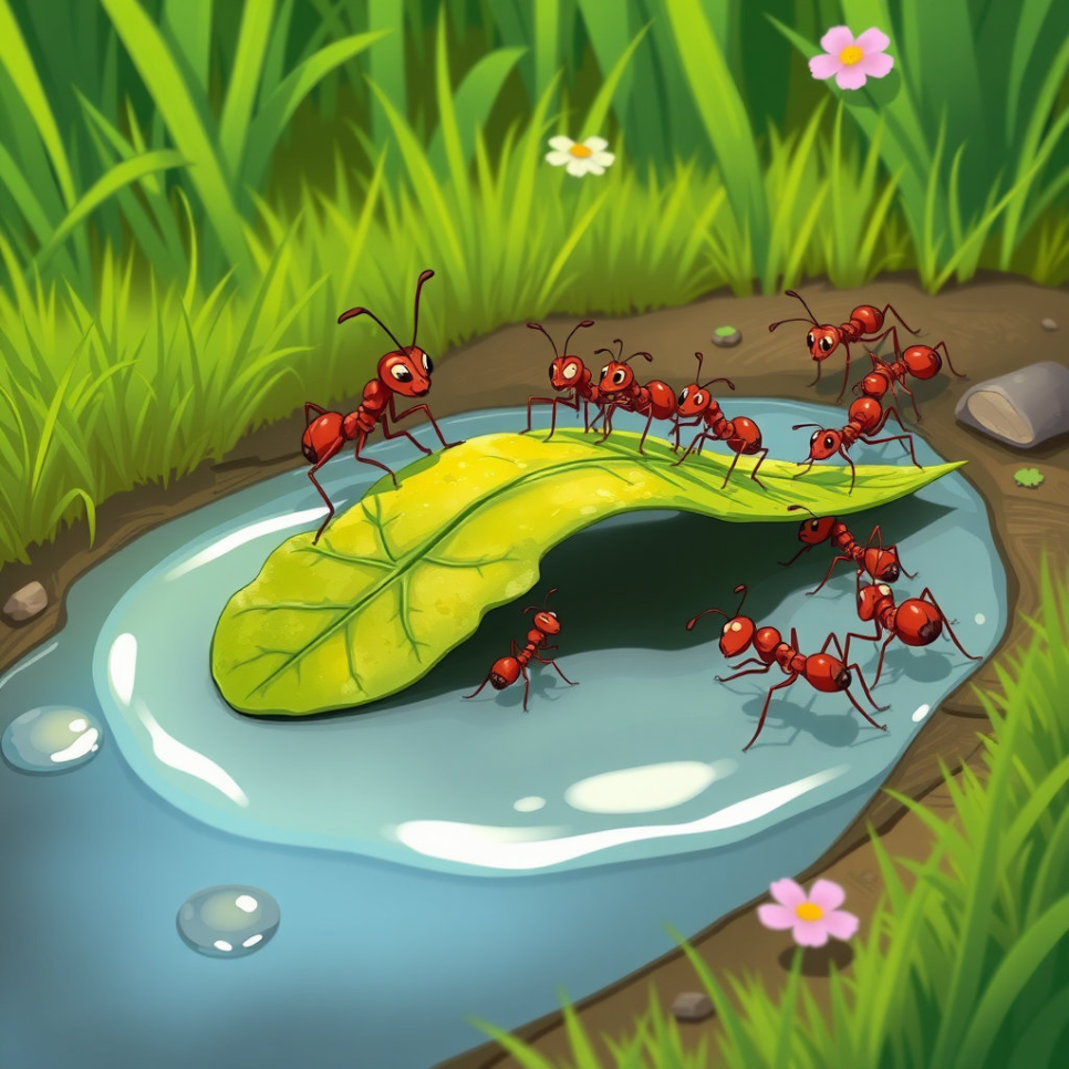 하지만 예상치 못한 커다란 물 웅덩이가 그들의 앞길을 막아섰어요. 모두 당황했지만, 꼬마 개미는 가만히 물웅덩이를 바라보며 작은 아이디어를 떠올렸어요. 나뭇잎을 모아 징검다리를 만들고, 서로 밀고 끌어주며 마침내 모두 안전하게 물웅덩이를 건널 수 있었답니다. 꼬마 개미들은 함께 머리를 맞대면 어떤 어려움도 헤쳐나갈 수 있다는 것을 깨달았어요.