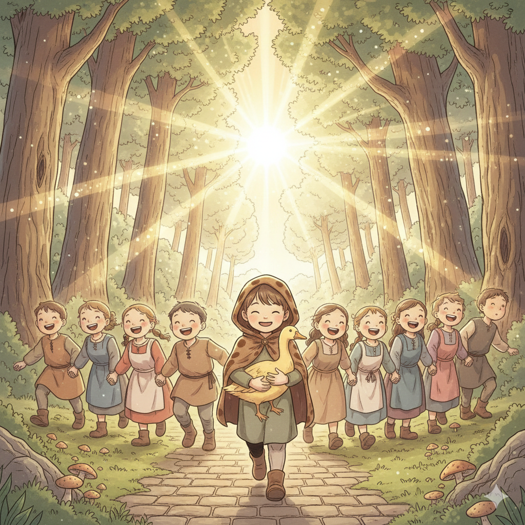 왕은 크게 기뻐하며 막내에게 원하는 것을 말해보라고 했습니다. 하지만 막내는 금이나 권력을 바라지 않았습니다. “모두가 웃을 수 있으면 충분해요.” 그 말에 왕과 신하들은 놀랐고, 공주는 막내에게 고맙다며 다가왔습니다. 황금 거위의 깃털은 그 순간 더욱 부드러운 빛으로 빛났습니다. 그것은 욕심을 채울 때가 아니라, 마음이 나눠질 때 가장 아름다웠습니다.