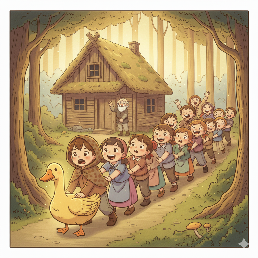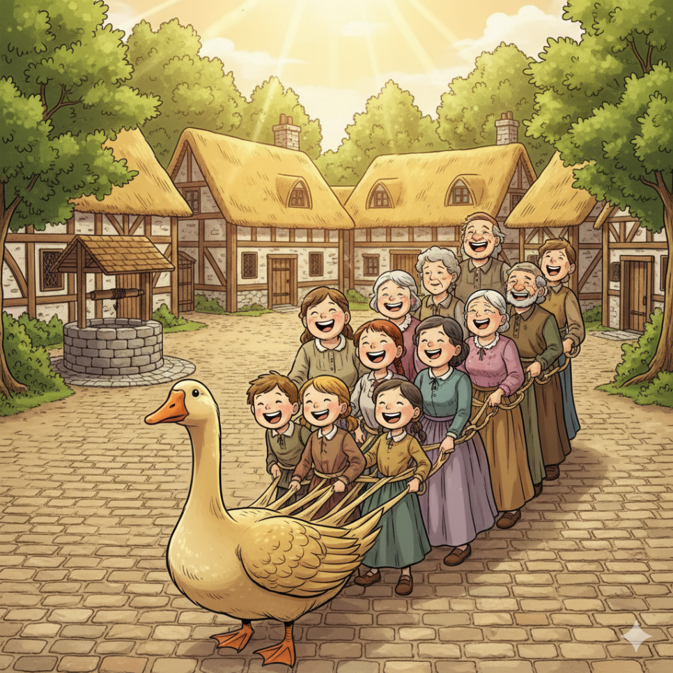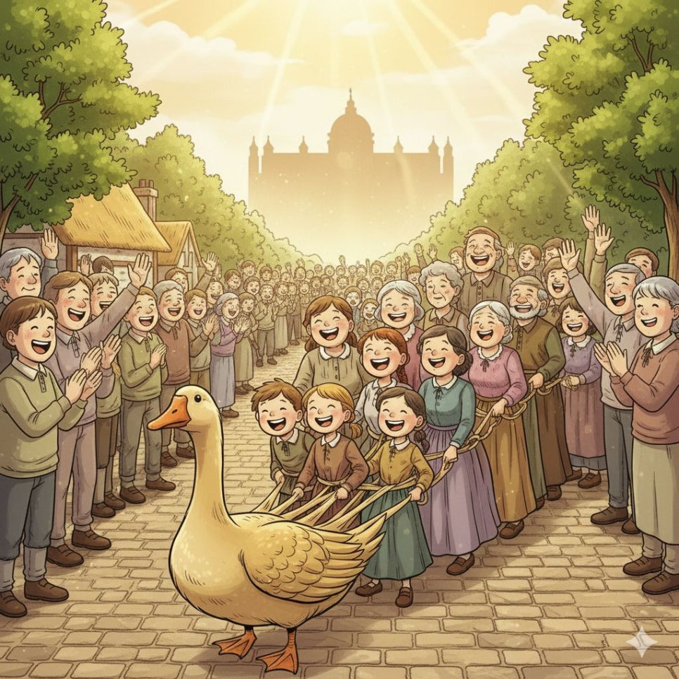 마을 어귀에 도착하자 사람들이 웅성거리기 시작했습니다. “저게 정말 황금 거위야?” 호기심 많은 마을 사람이 거위의 깃털을 살짝 만지는 순간, 손이 깃털에 딱 붙어 떨어지지 않았습니다. 사람은 놀라 비명을 질렀고, 그 소리를 듣고 다른 이들이 달려왔습니다. 한 명, 두 명, 차례로 붙어버리며 이상한 행렬이 만들어졌습니다. 막내는 당황했지만 거위를 놓아주지 않았습니다. 거위는 가만히 있었고, 사람들은 웃음과 놀라움 속에 줄지어 서게 되었습니다.