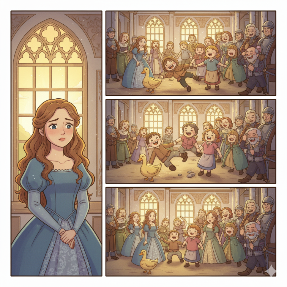왕궁에서 공주는 창가에 앉아 무표정한 얼굴로 세상을 내려다보고 있었습니다. 황금 거위와 이상한 행렬이 들어오자 공주는 처음엔 고개를 돌렸습니다. 하지만 사람들이 서로 붙은 채 넘어지고 웃는 모습을 보며, 공주의 입꼬리가 아주 조금 올라갔습니다. 막내가 실수로 넘어지자, 거위가 삐약 소리를 냈고, 그 모습에 공주는 결국 웃음을 터뜨렸습니다. 왕궁에 처음 울려 퍼지는 공주의 웃음소리였습니다.
