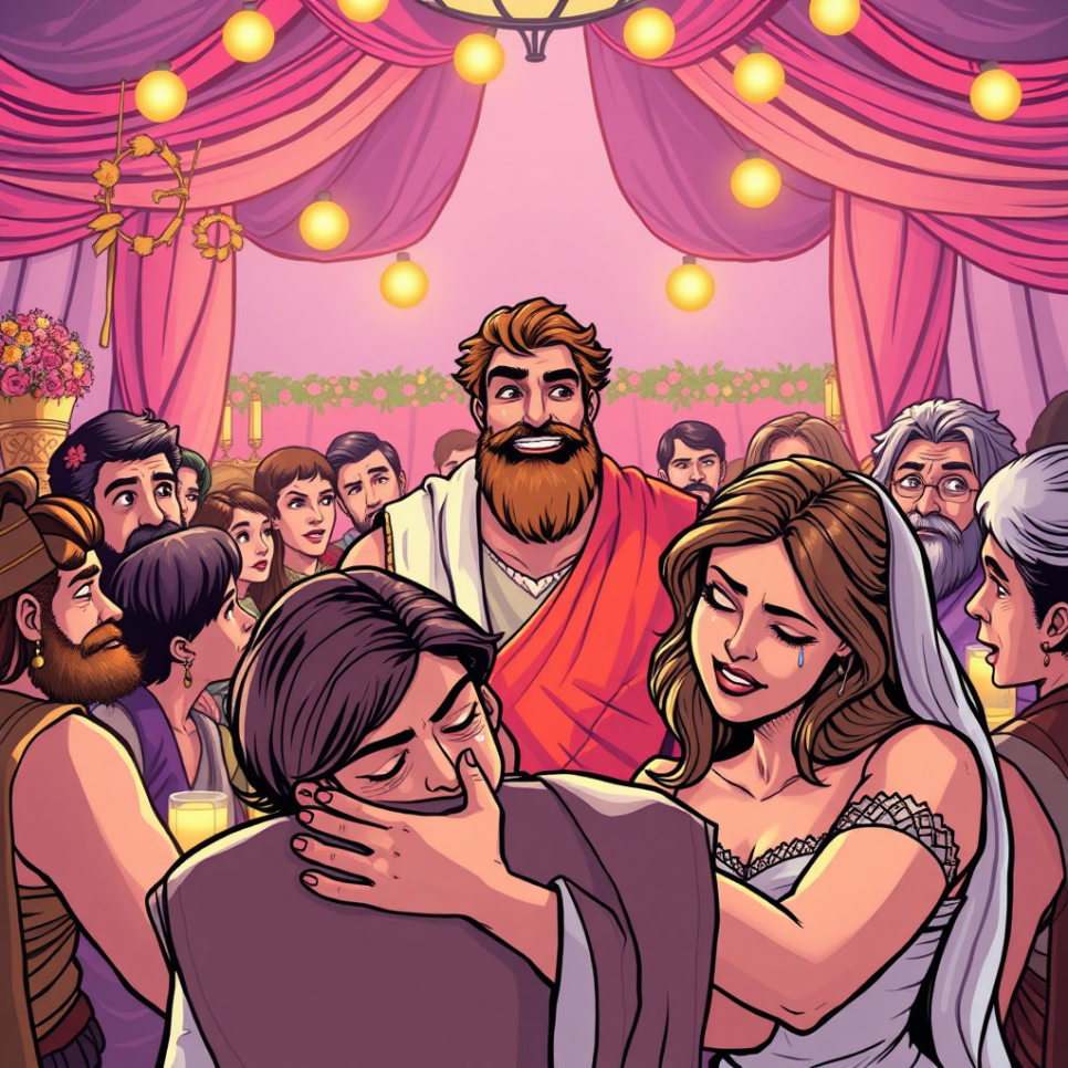 감옥에서 오랜 시간이 흐르는 동안, 신기하게도 삼손의 잘렸던 머리카락이 다시 자라기 시작했어요. 블레셋 사람들은 큰 축제를 열고 삼손을 끌어내어 그를 조롱했어요. 많은 사람들이 모인 자리에서 그들은 삼손을 기둥 사이에 세워 재미있게 구경했죠.