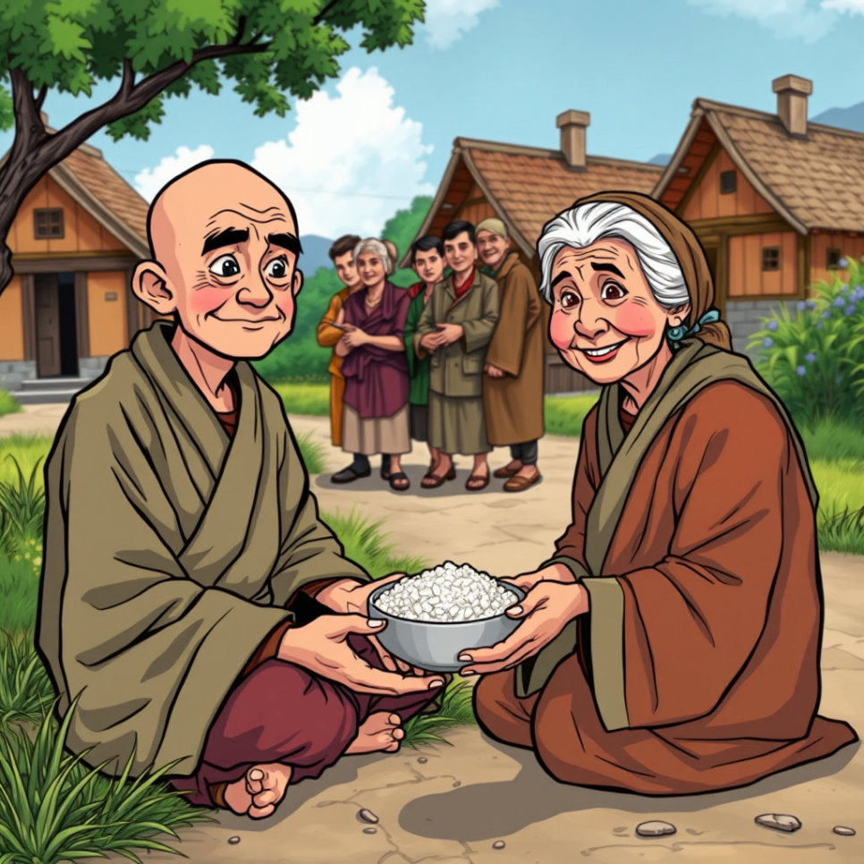 오래 전, 산 속에서 수행하던 한 스님이 있었어요. 어느 날, 긴 수행을 마치고 내려오던 길에 배가 고파 쓰러질 듯했어요. 그때 작은 마을이 보였고, 스님은 조심스럽게 마을 사람들에게 밥을 구했지요. 하지만 사람들은 낯선 스님을 경계하며 음식을 나눠주지 않았어요. 스님은 속상했지만 조용히 마을 어귀에서 기도를 드렸어요. 이 모습을 본 한 노파가 다가와 따뜻한 밥 한 그릇을 건넸고, 스님은 감사한 마음으로 밥을 받아 먹었어요. 그 순간, 신비한 일이 일어났답니다!
