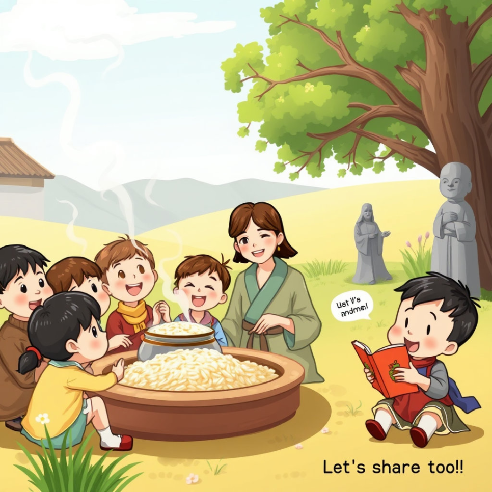 오랜 세월이 흐른 지금, 마을 사람들은 여전히 그 밥그릇 이야기를 기억하고 있어요. 마법 같은 그릇은 사라졌지만, 사람들의 마음속에는 ‘나누는 기쁨’이 깊이 자리 잡았지요.
