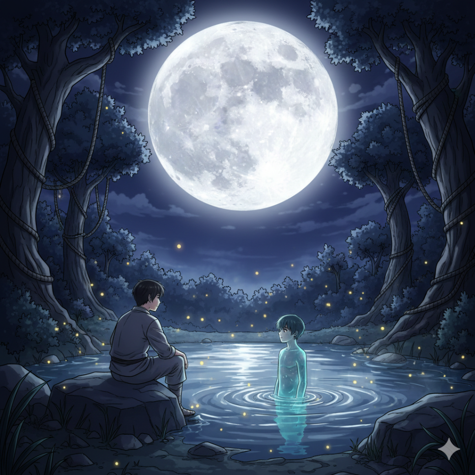 달빛 아래 민수가 만난 것은 무서운 귀신이 아니라 백 년 동안 혼자 외로웠던 소년 '물결이'였습니다. 물결이는 오래전 연못에 빠져 정령이 되었지만, 사람들의 오해와 두려움 때문에 더욱 고립되어 왔습니다.