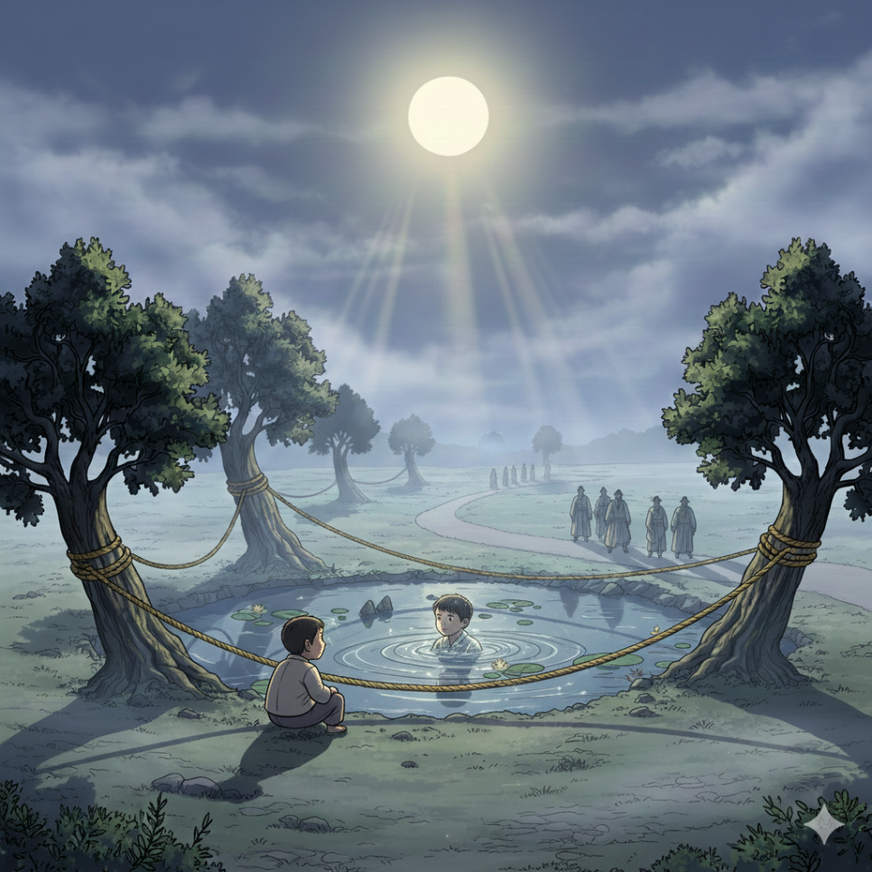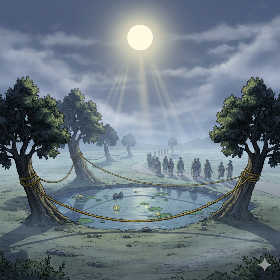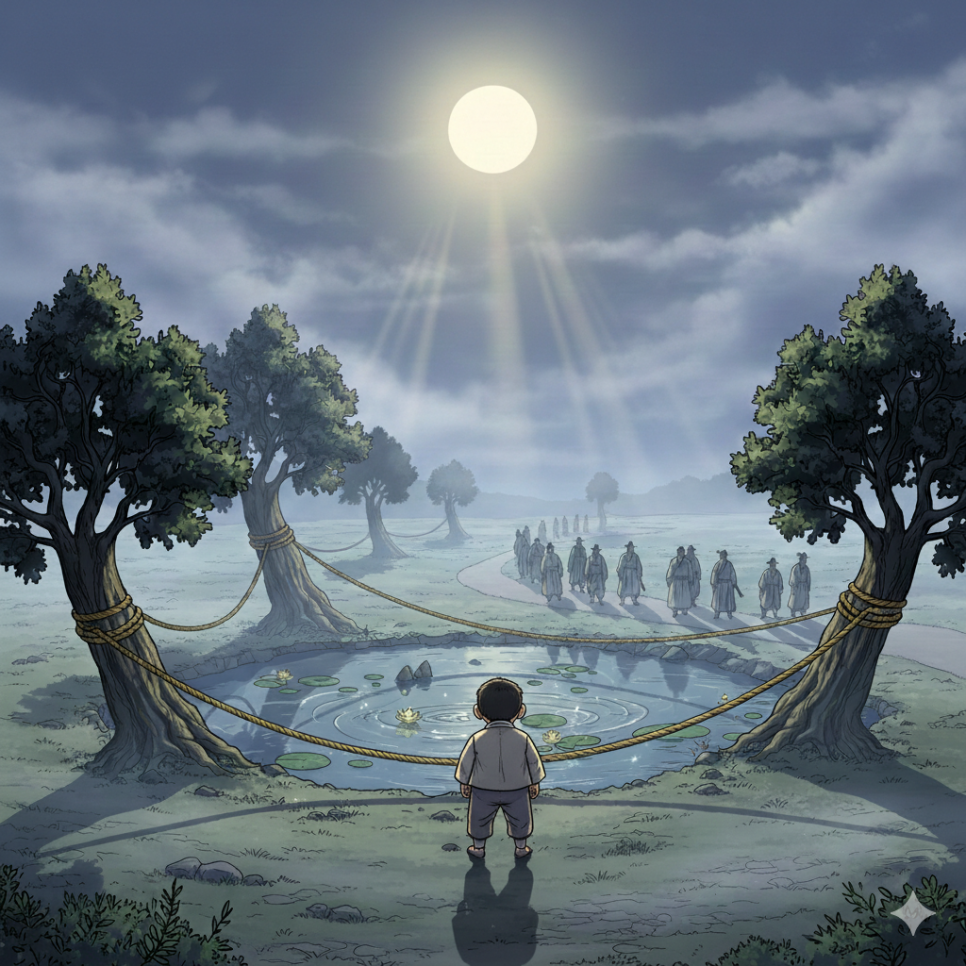 그래서 마을 사람들은 연못 주변에 금줄을 치고, 아이들이 절대 가까이 가지 못하도록 했습니다. 연못은 점점 사람들의 발길이 끊기면서 수풀에 둘러싸여 더욱 으스스해졌습니다. 하지만 이것은 시작에 불과했습니다. 이 연못에는 마을 사람들이 알지 못하는 진짜 이야기가 숨어 있었으니까요.