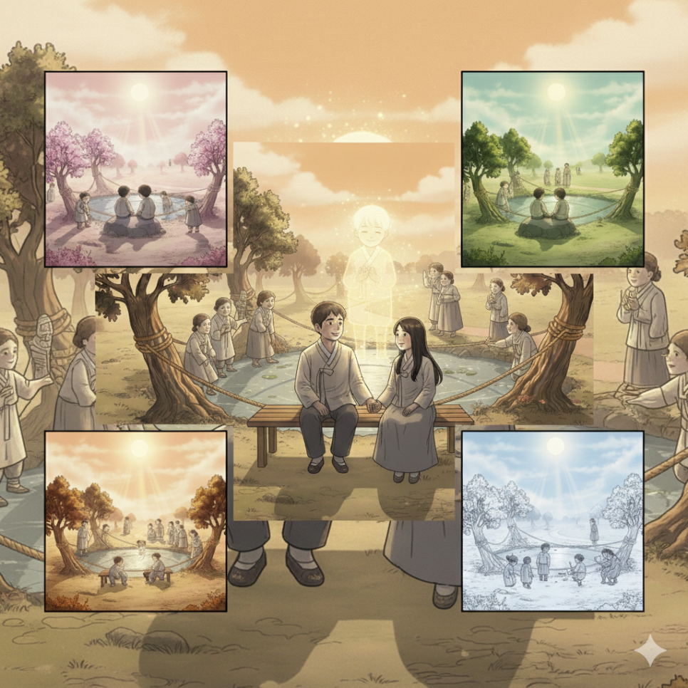 계절이 네 번 바뀌었습니다. 연못은 이제 마을에서 가장 아름다운 곳이 되었습니다. 봄에는 벚꽃이 물 위에 떨어져 분홍빛 물결을 만들고, 여름에는 아이들이 연못가에서 물장난을 치며 놀았습니다. 가을에는 단풍잎이 수면을 수놓고, 겨울에는 하얀 눈이 연못을 감싸 안았습니다.