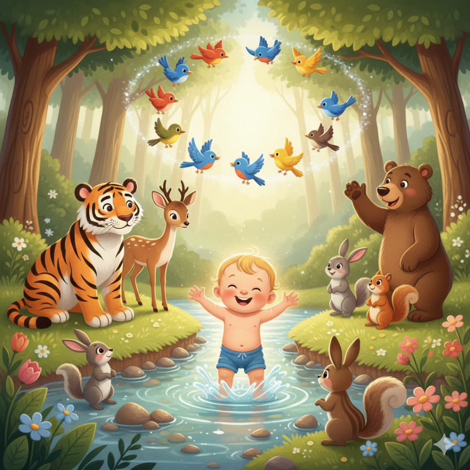 아이가 씻자 몸에서 빛이 나고, 새와 짐승들이 모여들어 함께 춤을 추는 기적이 일어나요.