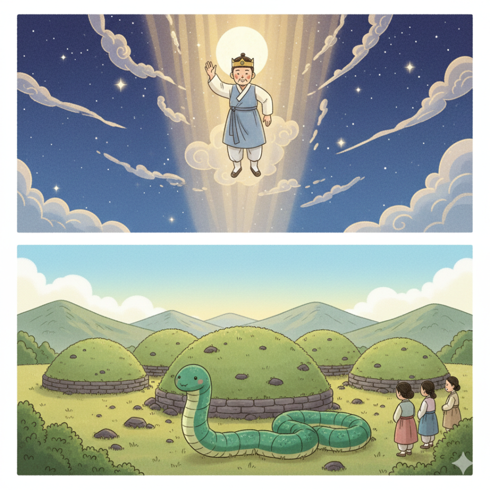 세월이 흘러 나라를 61년 동안이나 평화롭게 다스린 박혁거세 왕은 다시 하늘로 올라갈 때가 되었어요. 어느 날, 혁거세 왕은 눈부신 빛에 싸여 하늘로 솟아올랐지요. 며칠 뒤 왕의 몸은 다섯 부분으로 나뉘어 땅으로 내려왔는데, 백성들이 슬퍼하며 이를 합치려 하자 커다란 뱀 한 마리가 나타나 방해를 했어요. "이것 또한 하늘의 뜻이다." 백성들은 왕의 몸을 다섯 곳의 무덤에 나누어 정성껏 모셨고, 이를 '오릉' 또는 '사릉'이라고 불렀어요. 박혁거세는 떠났지만, 그가 남긴 사랑과 지혜는 신라 백성들의 마음속에 영원히 지지 않는 별처럼 남아 오늘날까지 전해지고 있답니다.