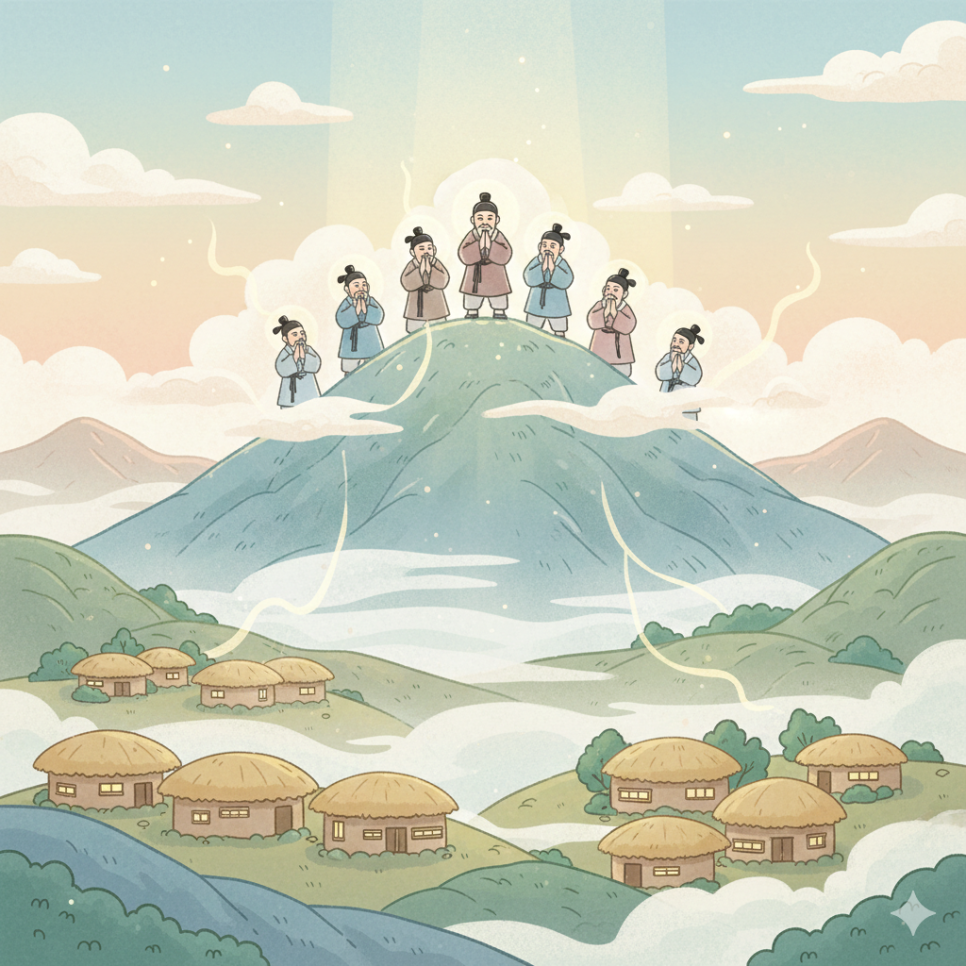 아주 먼 옛날, 지금의 경주 땅에는 '진한'이라고 불리는 넓고 비옥한 벌판이 있었어요. 이곳에는 알천 양산촌, 돌산 고허촌, 취산 진지촌, 무산 대수촌, 금산 가리촌, 명활산 고야촌이라는 여섯 개의 마을이 옹기종기 모여 살고 있었지요. 각 마을에는 지혜로운 촌장들이 있어 마을 사람들을 돌보았지만, 고민이 하나 있었어요. "우리 여섯 마을을 하나로 묶어줄 훌륭한 임금님이 계시면 얼마나 좋을까?" 촌장들은 자주 모여 의논했어요. 백성들은 착하고 부지런했지만, 나라의 기틀이 없어 큰일이 생기면 갈팡질팡하기 일쑤였거든요. 어느 날, 여섯 촌장은 높은 산에 올라가 간절히 빌었어요. "하늘이시여, 우리에게 세상을 밝힐 성스러운 지도자를 보내주소서!" 그들의 간절한 목소리가 산 너머 구름 위까지 닿을 듯 울려 퍼졌습니다.