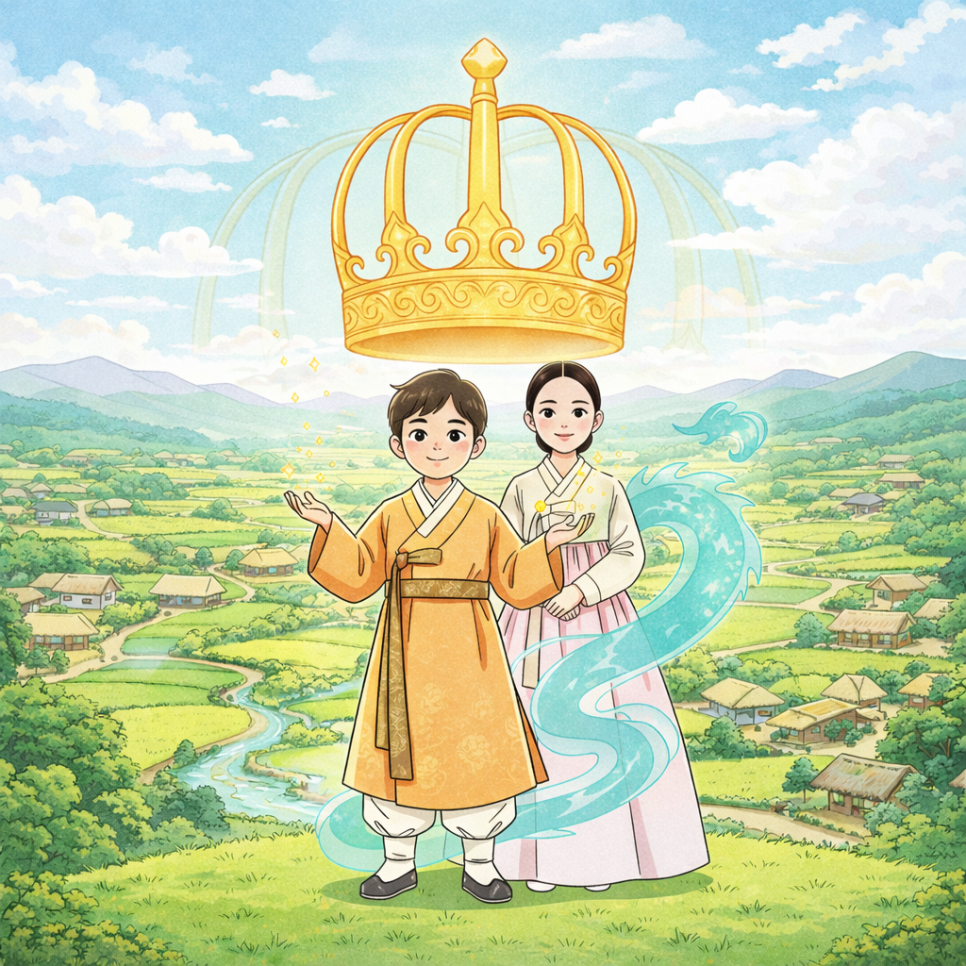 혁거세의 나이가 열세 살이 되던 해, 여섯 촌장과 백성들은 더 이상 미룰 수 없다고 생각했어요. 그들은 가장 높은 언덕에 제단을 차리고 혁거세를 왕으로 모시는 성대한 의식을 열었습니다. "우리의 왕이 되어 주십시오! 우리를 하나로 묶어 주십시오!" 백성들의 환호성이 산천을 울렸어요. 어린 나이였지만 혁거세의 눈빛은 깊고 단단했어요. 그는 알영 부인과 함께 제단에 올라 하늘에 맹세했어요. "나는 백성들을 내 몸처럼 아끼고, 정의롭고 평화로운 나라를 만들겠노라." 이것이 바로 우리나라 역사에서 가장 오래도록 빛난 왕국 중 하나인 신라의 첫걸음이었어요.