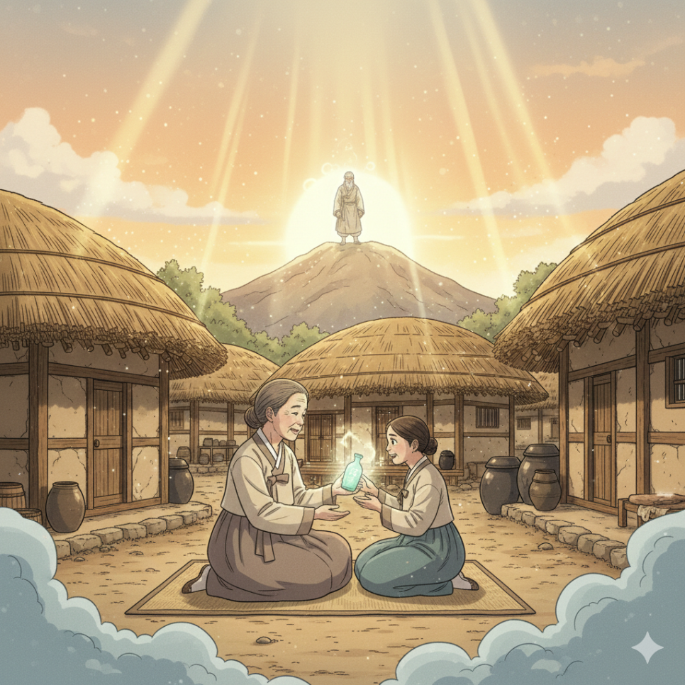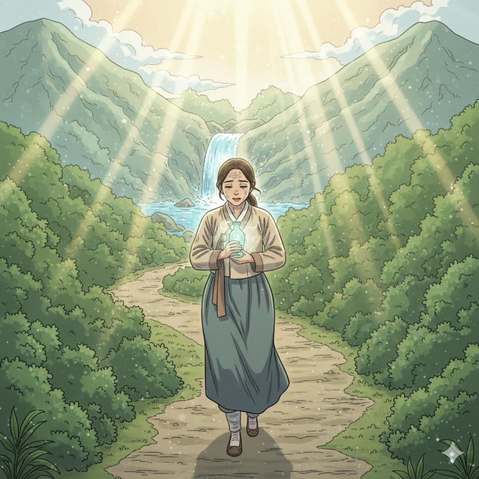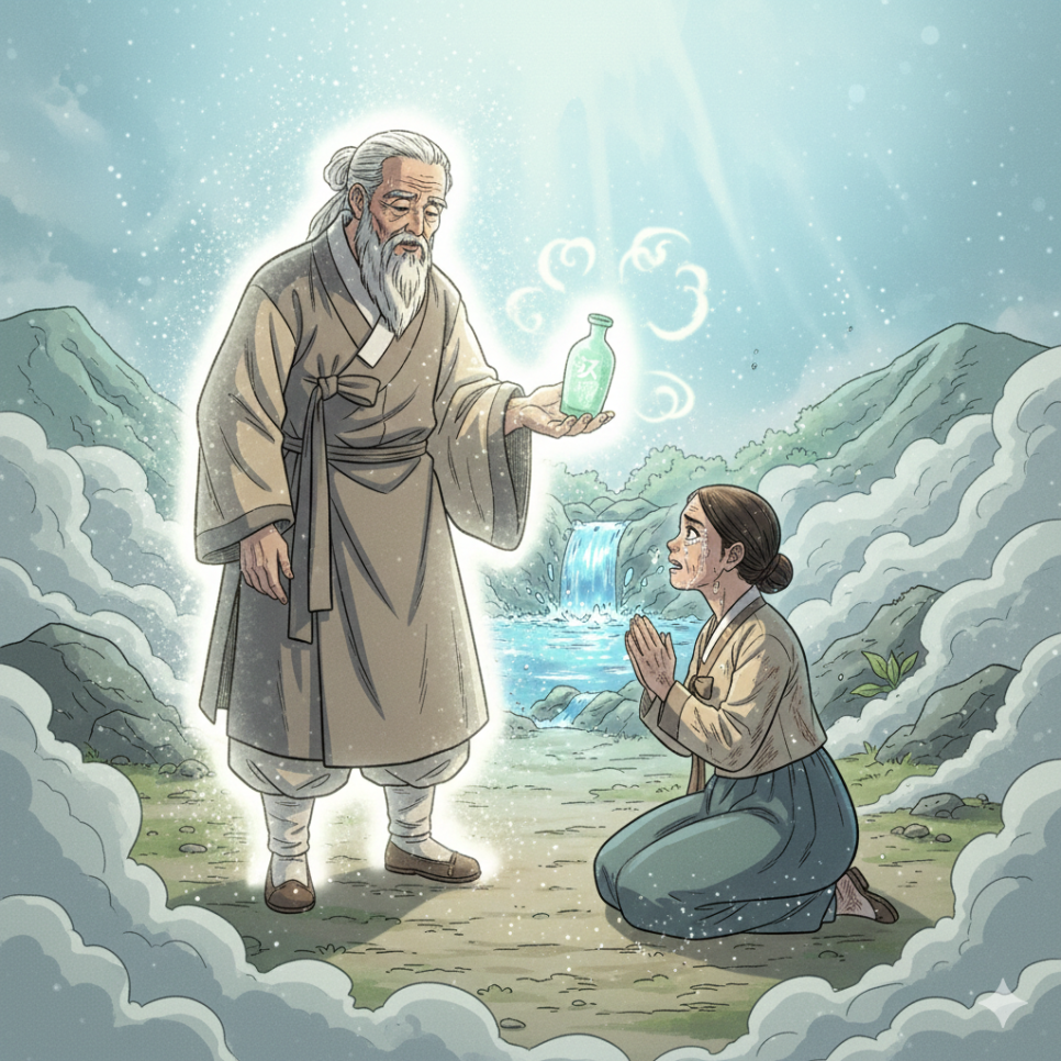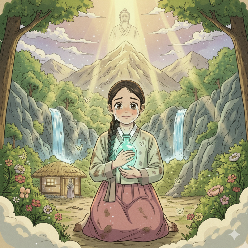 노인은 지은이를 찬찬히 바라보았습니다. 어린 소녀의 옷은 찢어져 있었고, 맨발에는 피가 맺혀 있었어요. 하지만 그 눈빛만큼은 맑고 간절했습니다. 노인은 고개를 끄덕이며 말했습니다. "이 물은 아무에게나 주는 것이 아니니라. 참된 효심을 가진 이에게만 허락되느니라."