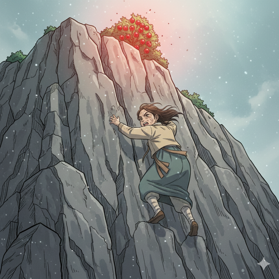 "첫 번째 시험이니라." 노인이 지팡이로 땅을 짚자, 갑자기 지은이 앞에 높고 가파른 절벽이 나타났습니다. "저 절벽 위에 있는 붉은 열매를 따 오너라. 하지만 손만 사용해야 하느니라."