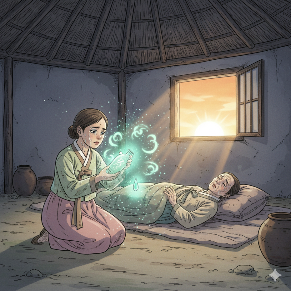 "엄마! 제가 왔어요!" 지은이는 서둘러 옥병의 마개를 열고 약수를 조심스럽게 어머니의 입에 떨어뜨렸습니다. 한 방울, 두 방울, 맑고 신비로운 약수가 어머니의 입술을 적셨어요.