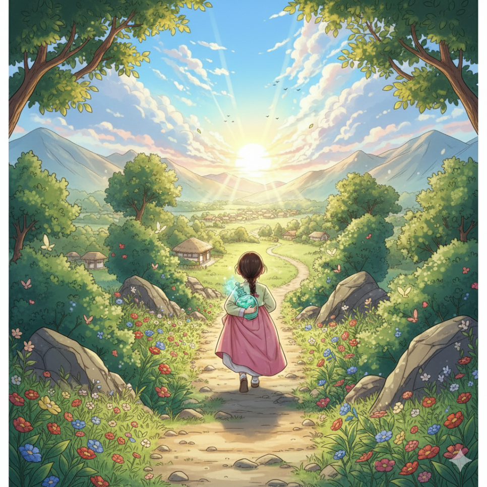 산신령님이 손을 흔들자 밝은 빛이 지은이를 감싸더니, 지은이는 어느새 마을 입구에 서 있었어요. 꿈만 같았지만, 손에는 빛나는 옥병이 단단히 쥐어져 있었습니다.