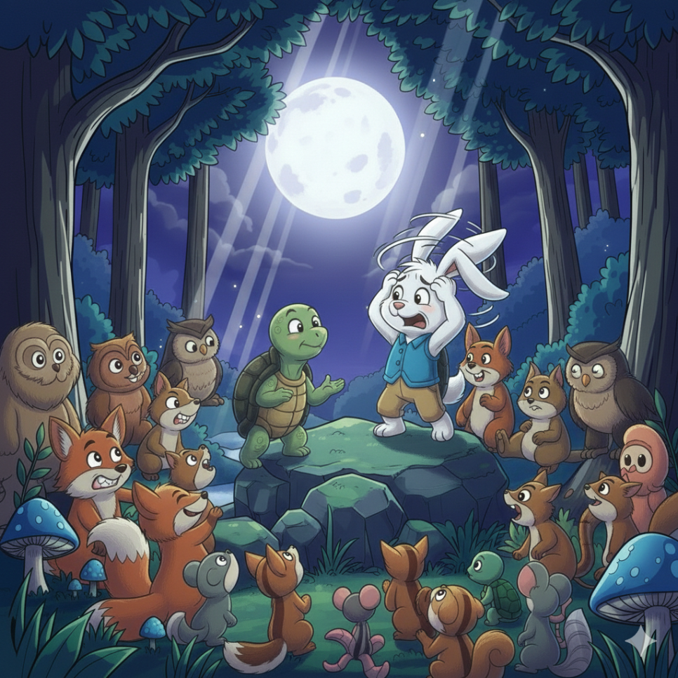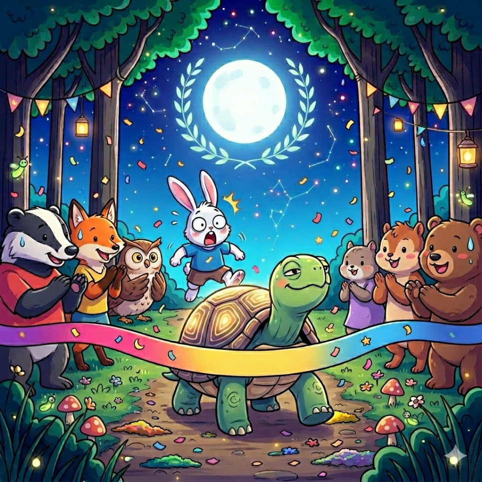 숲은 웅성거리기 시작했습니다. 토끼는 자신이 이길 거라 확신했고, 자라는 천천히 눈을 감았습니다.