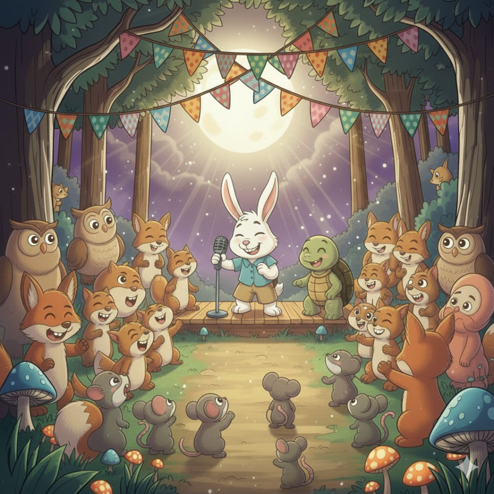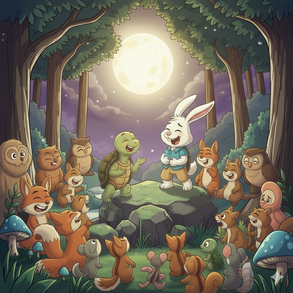 숲은 다시 웃음으로 가득 찼습니다. 이번에는 토끼를 놀리는 웃음이 아니라, 함께 웃는 웃음이었습니다.